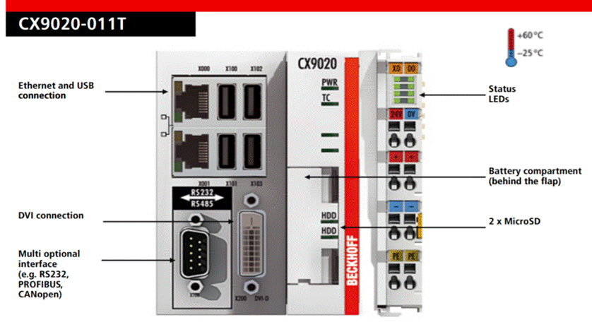 CX9020 | Basic CPU module The CX9020 is a compact, DIN rail-mountable Ethernet control system with 1 GHz ARM CortexTM-A8 CPU. The connection for the Beck off I/O systems is directly integrated into the CPU module. The unit offers automatic bus system identification (K-bus or E-bus) and independently switches in the corresponding mode. The CX9020 comprises the CPU with two micro SD card slots, the internal RAM and 128 KB NOVRAM as non-volatile memory. The basic configuration also includes two switched Ethernet RJ45 interfaces, four USB 2.0 interfaces and a DVI-D interface. The RJ45 interfaces are connected to an internal switch and offer a simple option for creating a line topology without the need for additional Ethernet switches. The operating system is Microsoft Windows Embedded Compact 7. Twin CAT automation software transforms a CX9020 system into a powerful PLC and Motion Control system that can be operated with or without visualization. Optionally, the unit can be ordered with a fieldbus, serial or audio interface. The extended operating temperature range between -25 to +60° C enables application in climatically demanding situations.
