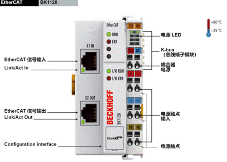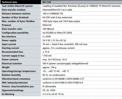 The BK1120 Bus Coupler connects Ether CAT with the K-bus components (KLXXXX) from the proven Beck off Bus Terminals range. One station consists of a BK1120 Bus Coupler, any number of terminals (up to 64; up to 255 with K-bus extension) and a bus end terminal. The Bus Coupler recognizes the connected terminals and automatically allocates them into the Ether CAT process image. The Bus Coupler is connected to the network via the upper Ethernet interface. The lower RJ45 socket may be used to connect further Ether CAT devices in the same strand. In the Ether CAT network, the BK1120 Bus Coupler can be installed anywhere in the Ethernet signal transfer section (100BASE-TX) - except directly at the switch. The coupler BK9000 (for K-bus components) is suitable for installation at the switch.