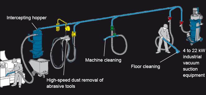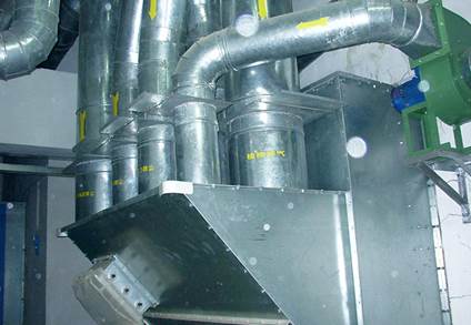 The system is composed of main box, dust filtering bucket, dust collecting bucket, dust collection pipe network, etc. Adopt high-pressure Roots fan, with suction pressure of 20000-30000 pa